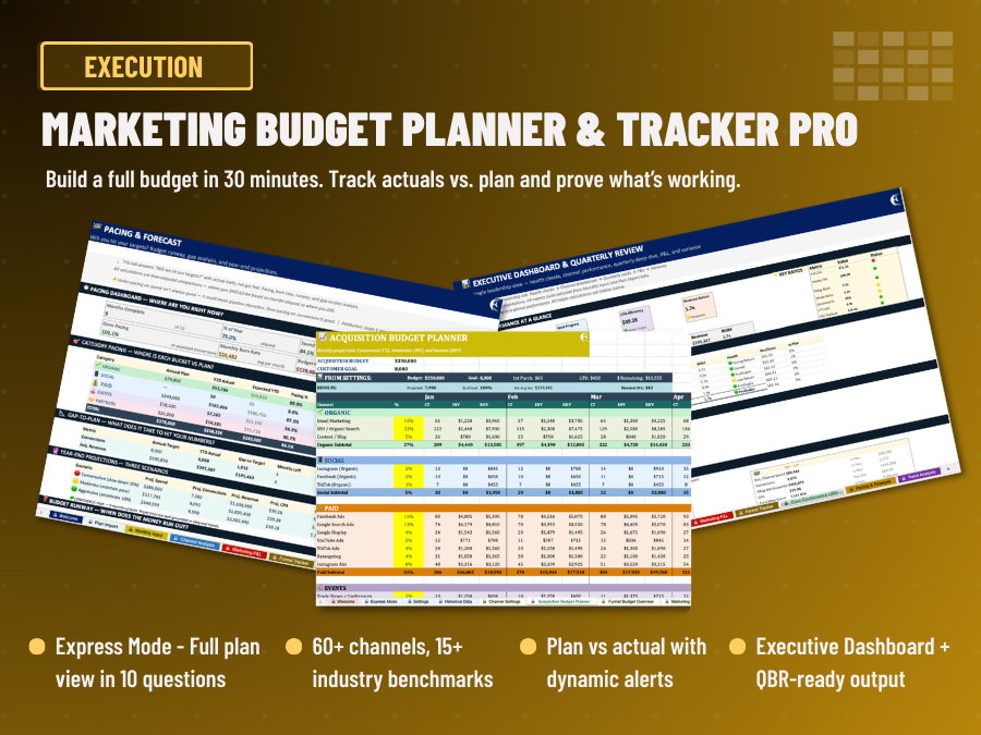 Two tools. One connected system. The Marketing Budget Planner auto-builds your entire marketing budget using real industry benchmarks — and gets smarter when you feed it your actual data. The Performance Tracker measures what's really happening and tells you exactly what to scale, cut, or fix.